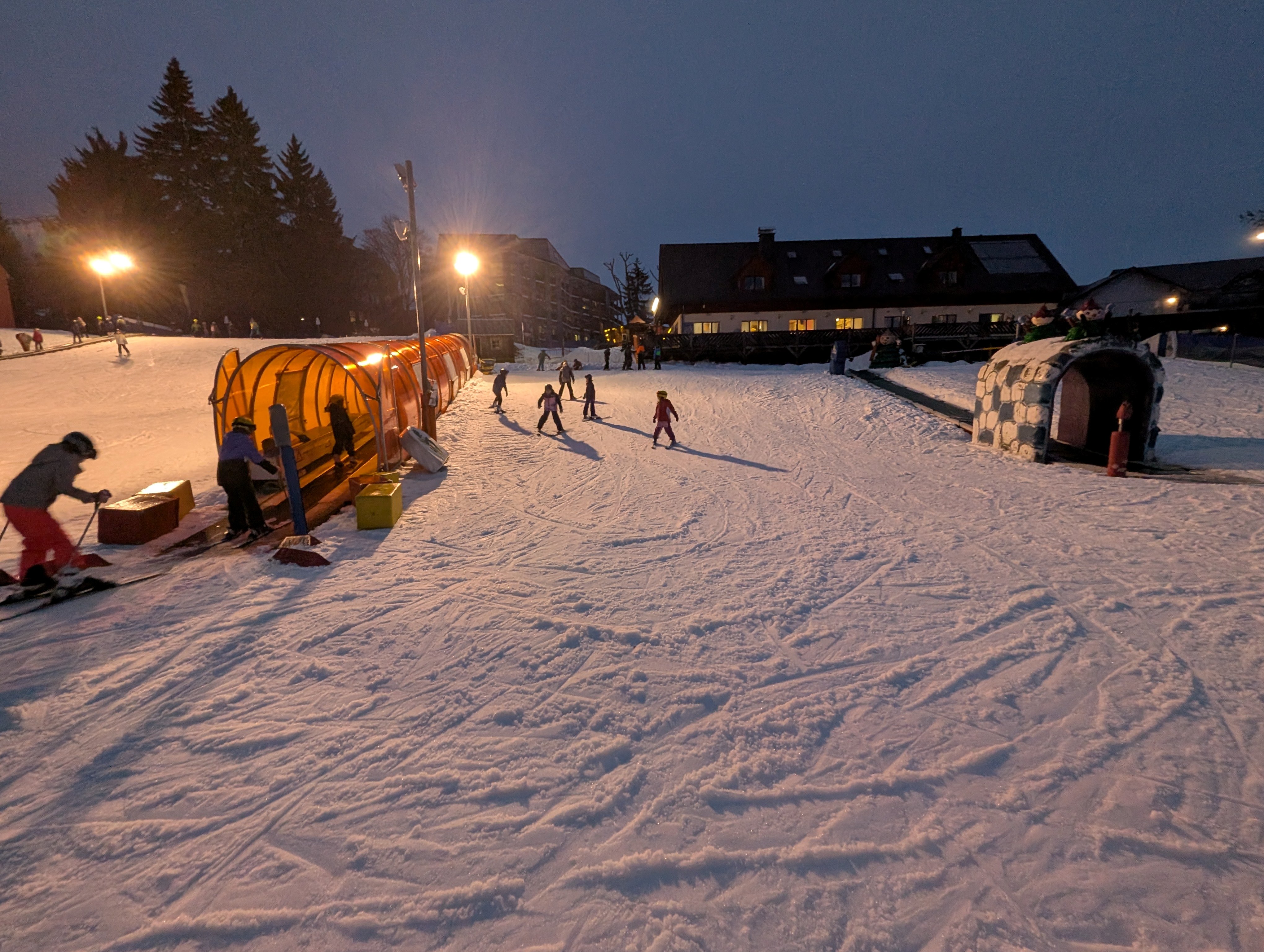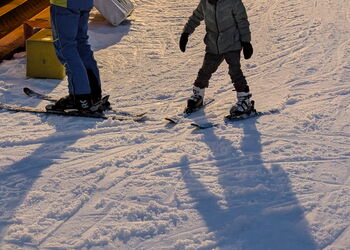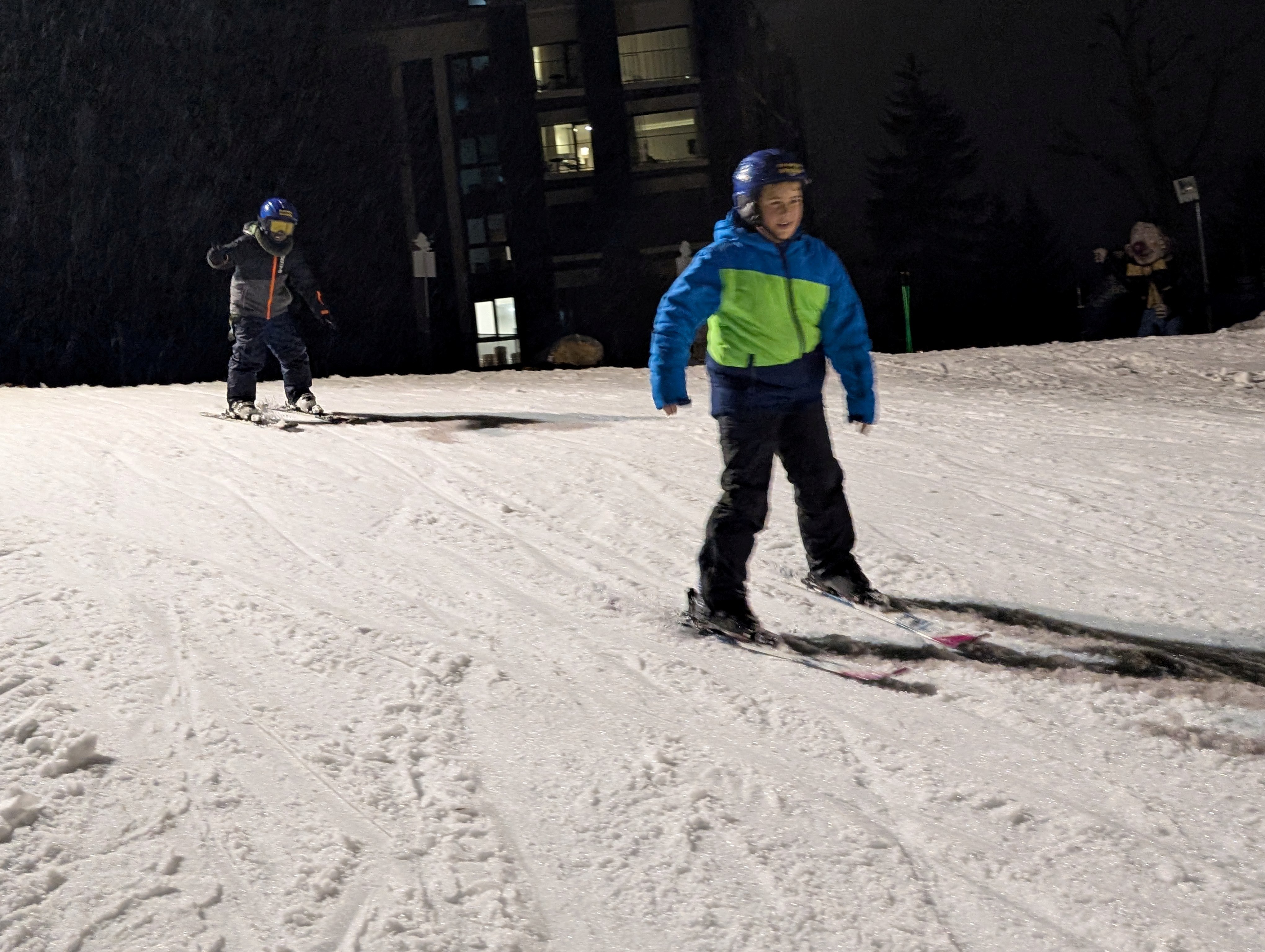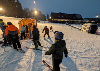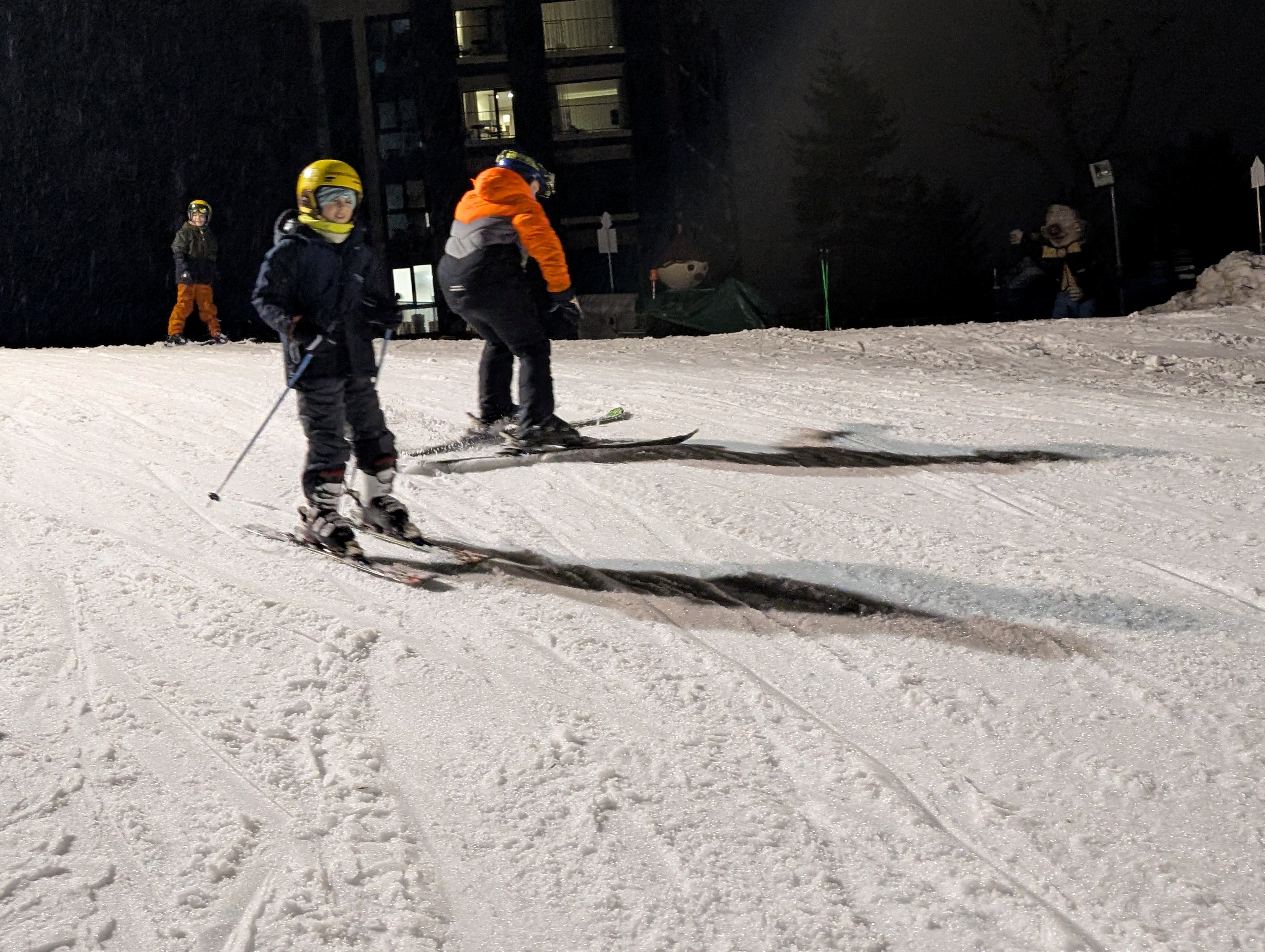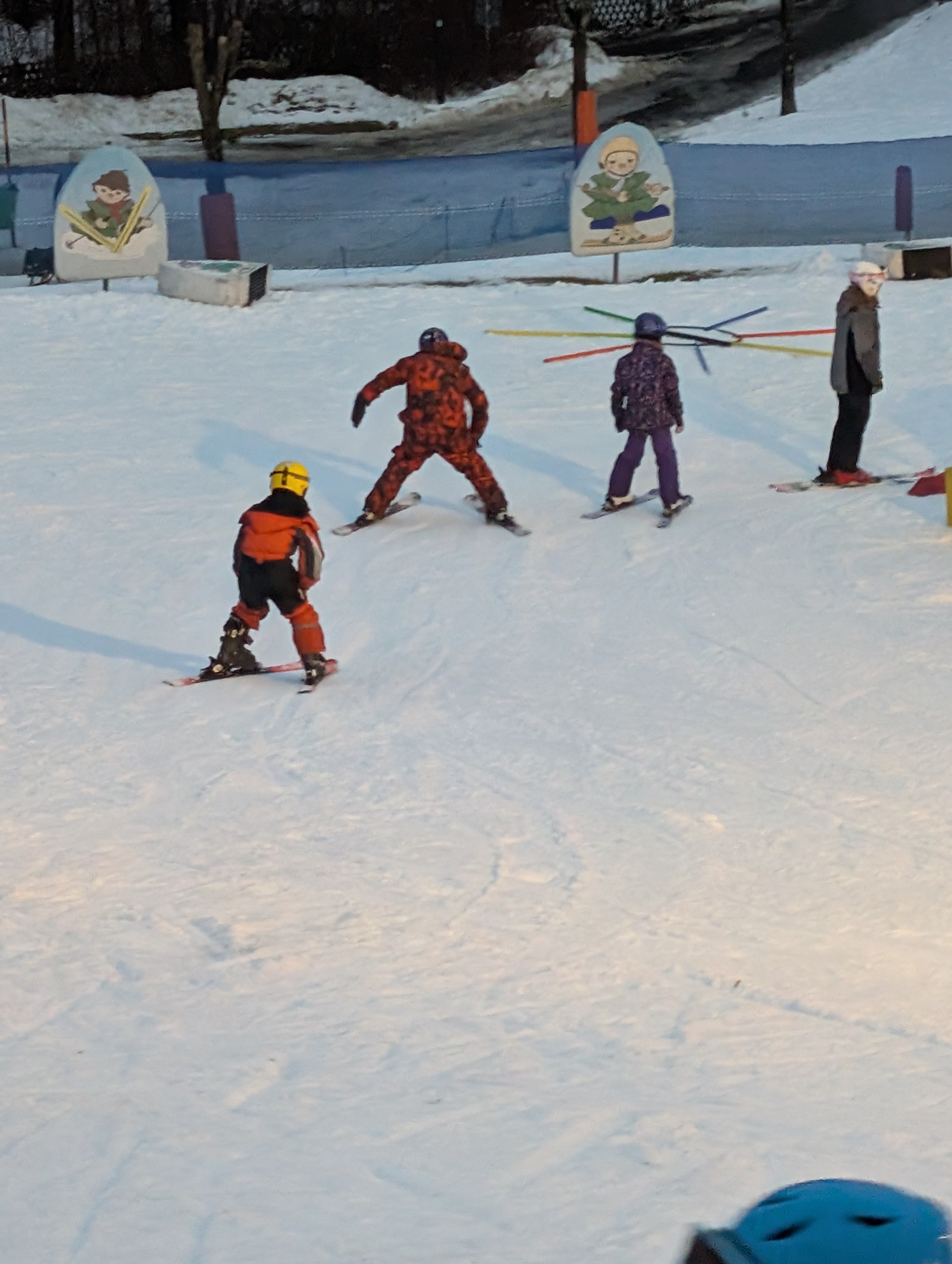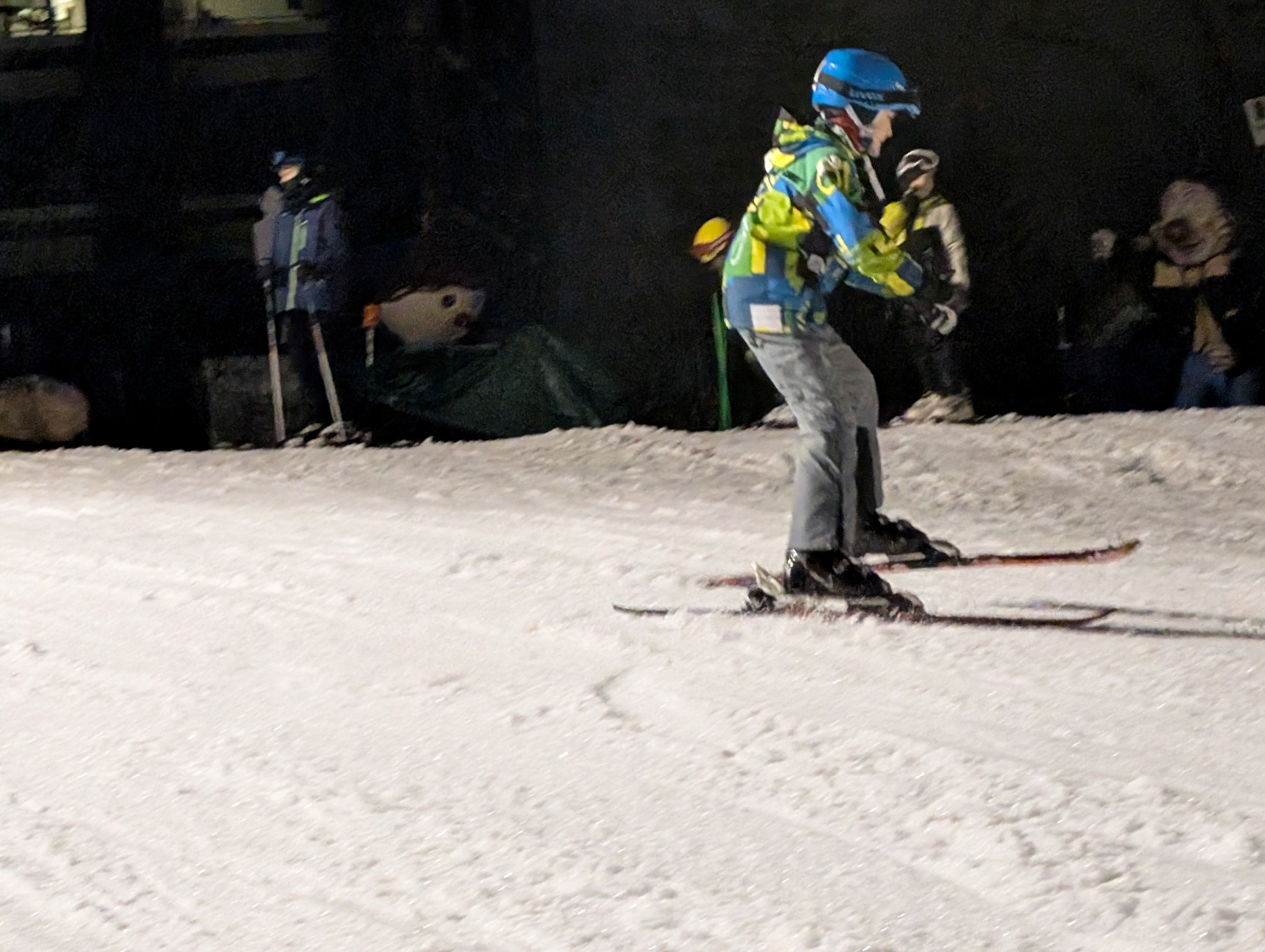 Voller Freude ging es zum zweiten Skitag. Ganz vfleißig wurde am kleinen und großen Hang geübt. Am meisten freuten sich alle auf das "Nacht"skifahren am Abend. Jeder konnte seinem Können entsprechend am Skischulhang frei fahren.